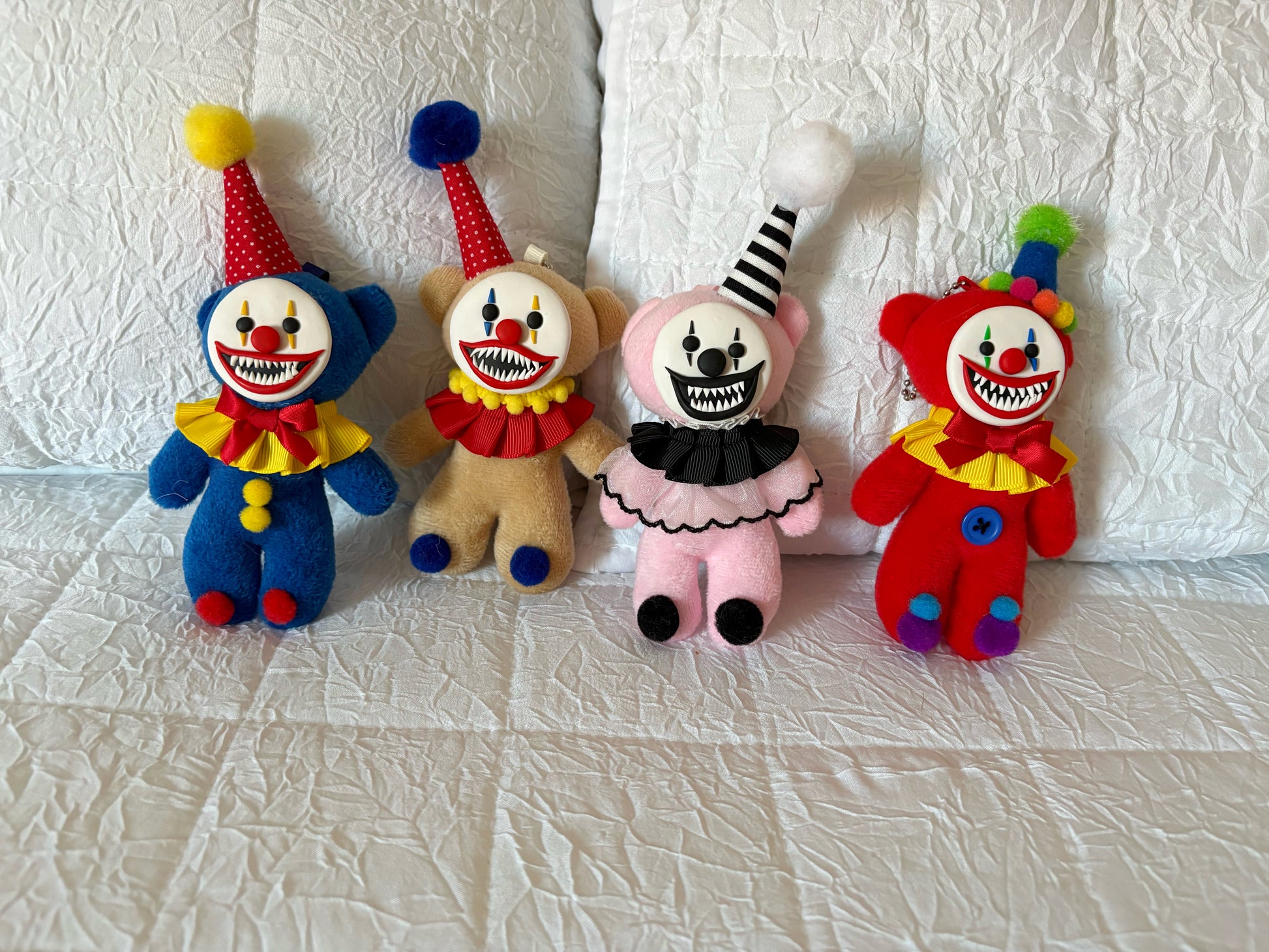 Born from the shadows of the midway, these Terror Bear Keychains are soft to the touch but unsettling at heart. With plush bodies, hand-sculpted faces, and lovingly crafted sewn and sculpted details, each bear emerges as a one-of-a-kind sideshow oddity. No two are alike—each one feels like it stepped straight out of a forgotten carnival tent. These bears are offered for adoption, waiting for a new home and a name of their own—inviting you to become part of their story.