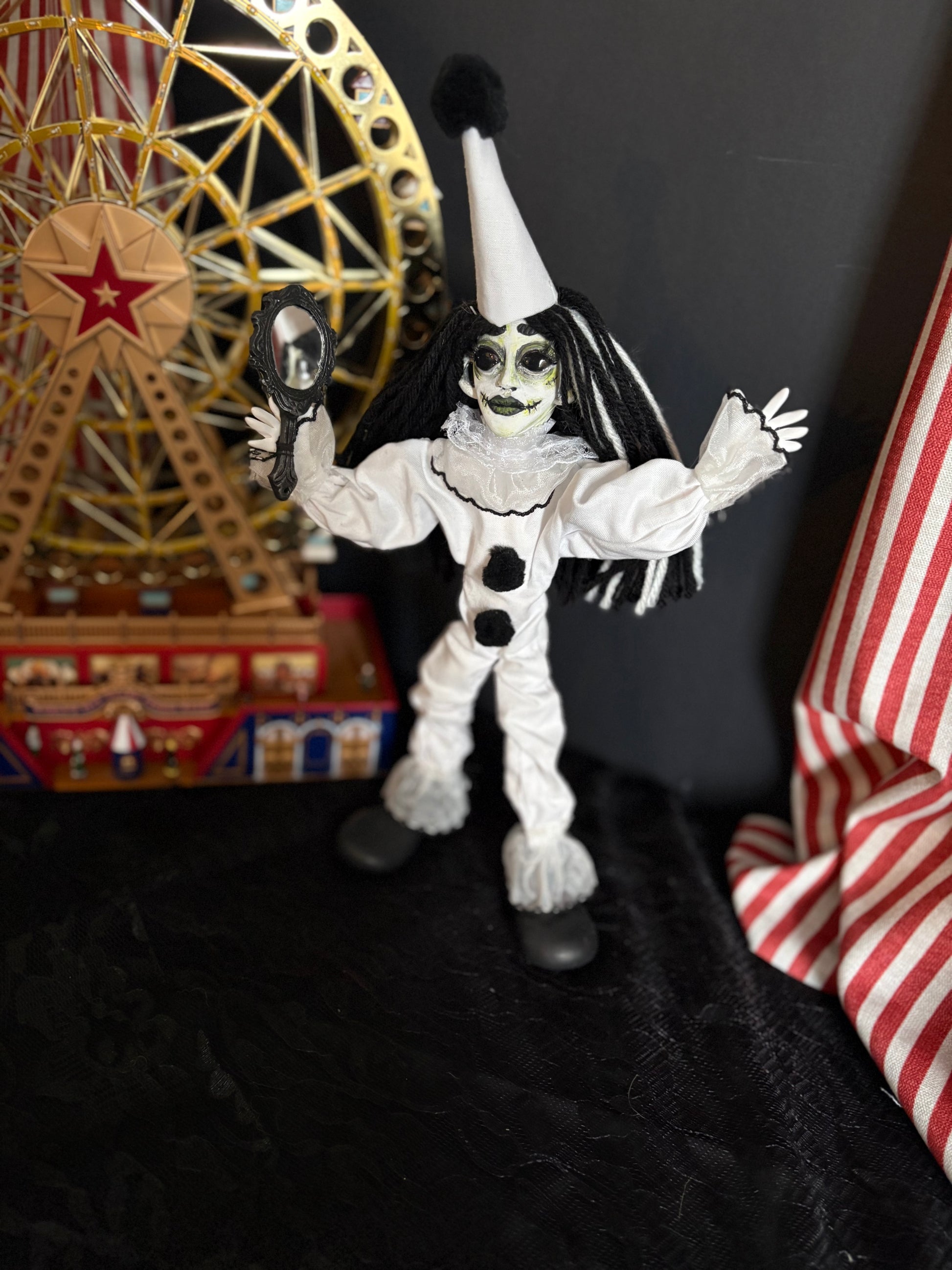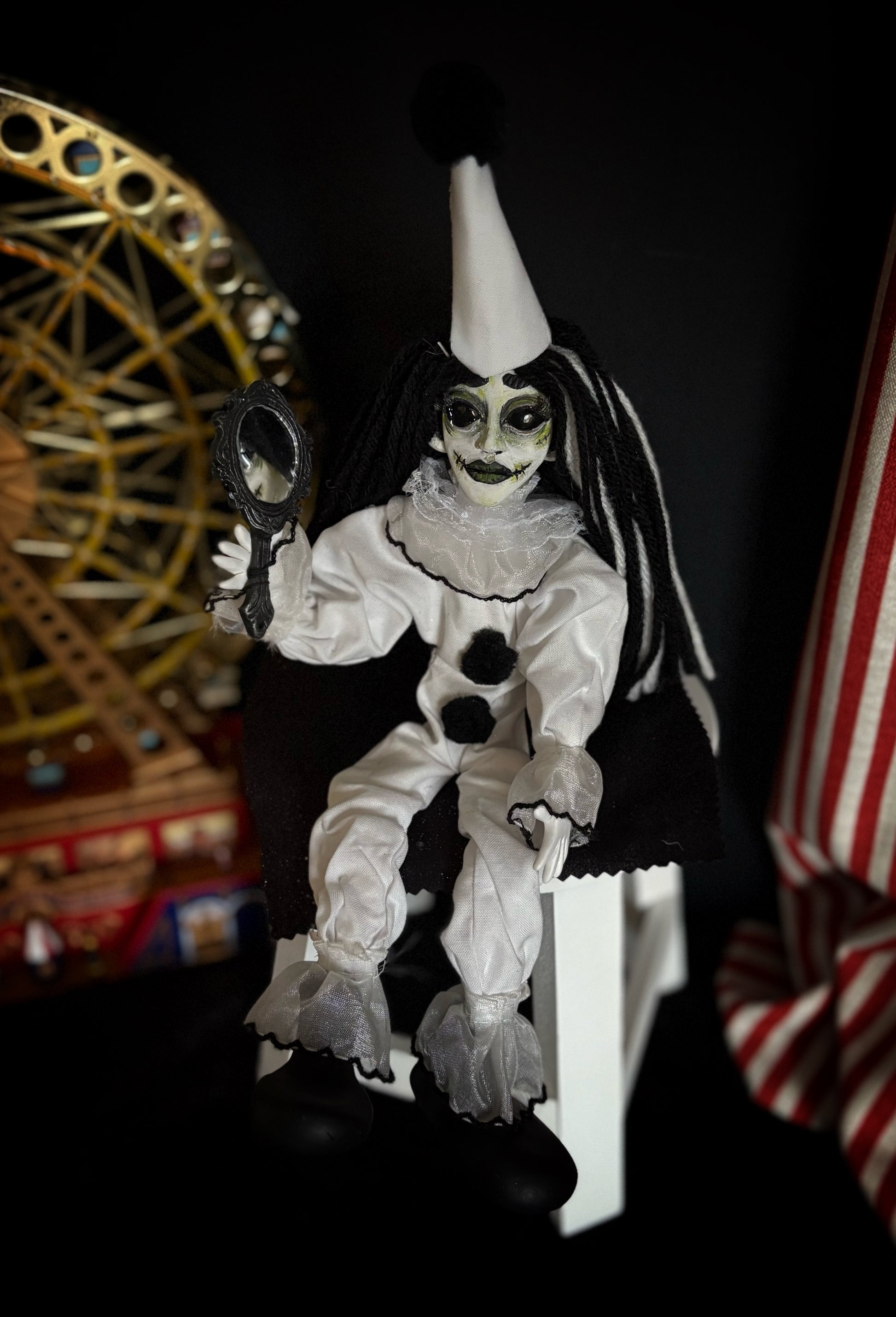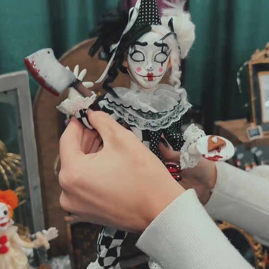 My handmade, posable dolls are crafted with hand-sculpted faces and eerie little details that make each one uniquely haunting. Perfect for fans of spooky art and circus-inspired oddities!