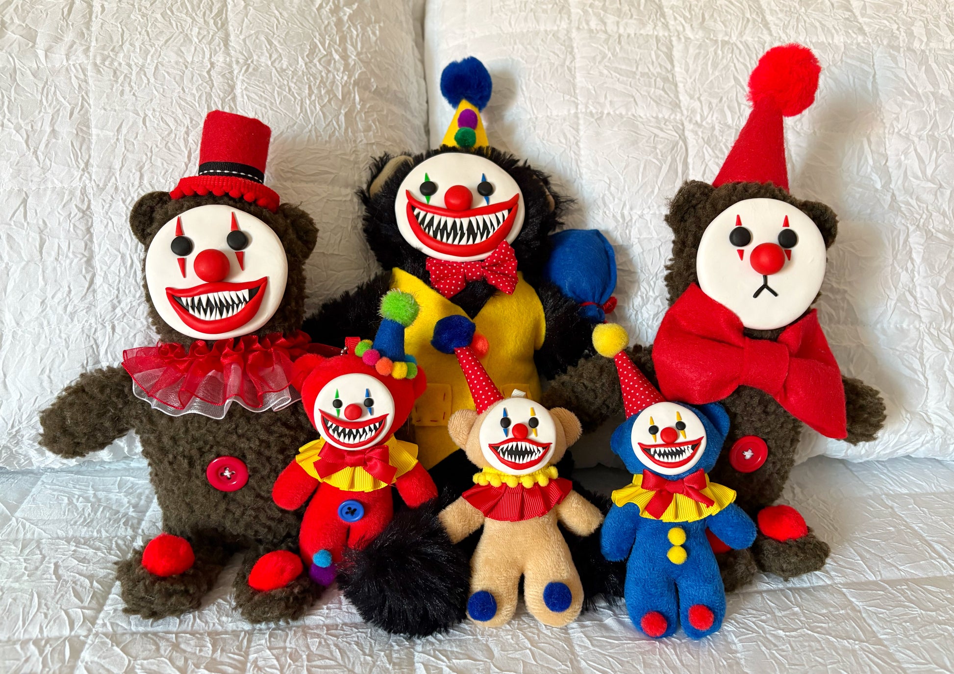 Born from the shadows of the midway, these Terror Bears are soft to the touch but unsettling at heart. With plush bodies, hand-sculpted faces, and lovingly crafted sewn and sculpted details, each bear emerges as a one-of-a-kind sideshow oddity. No two are alike—each one feels like it stepped straight out of a forgotten carnival tent. These bears are offered for adoption, waiting for a new home and a name of their own—inviting you to become part of their story.