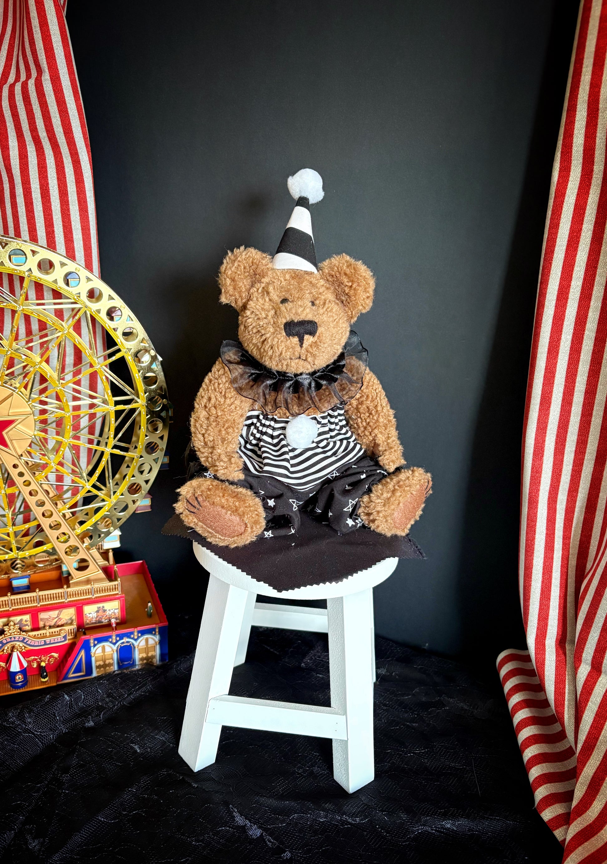 Buttons’ Band of Misfit Bears are secondhand bears lovingly restored by Tilly, dressed in carnival charm with hand-sewn outfits, and welcomed into the circus under Buttons’ gentle guidance.